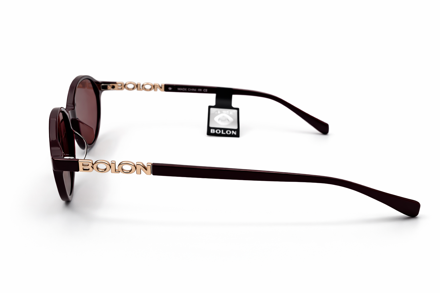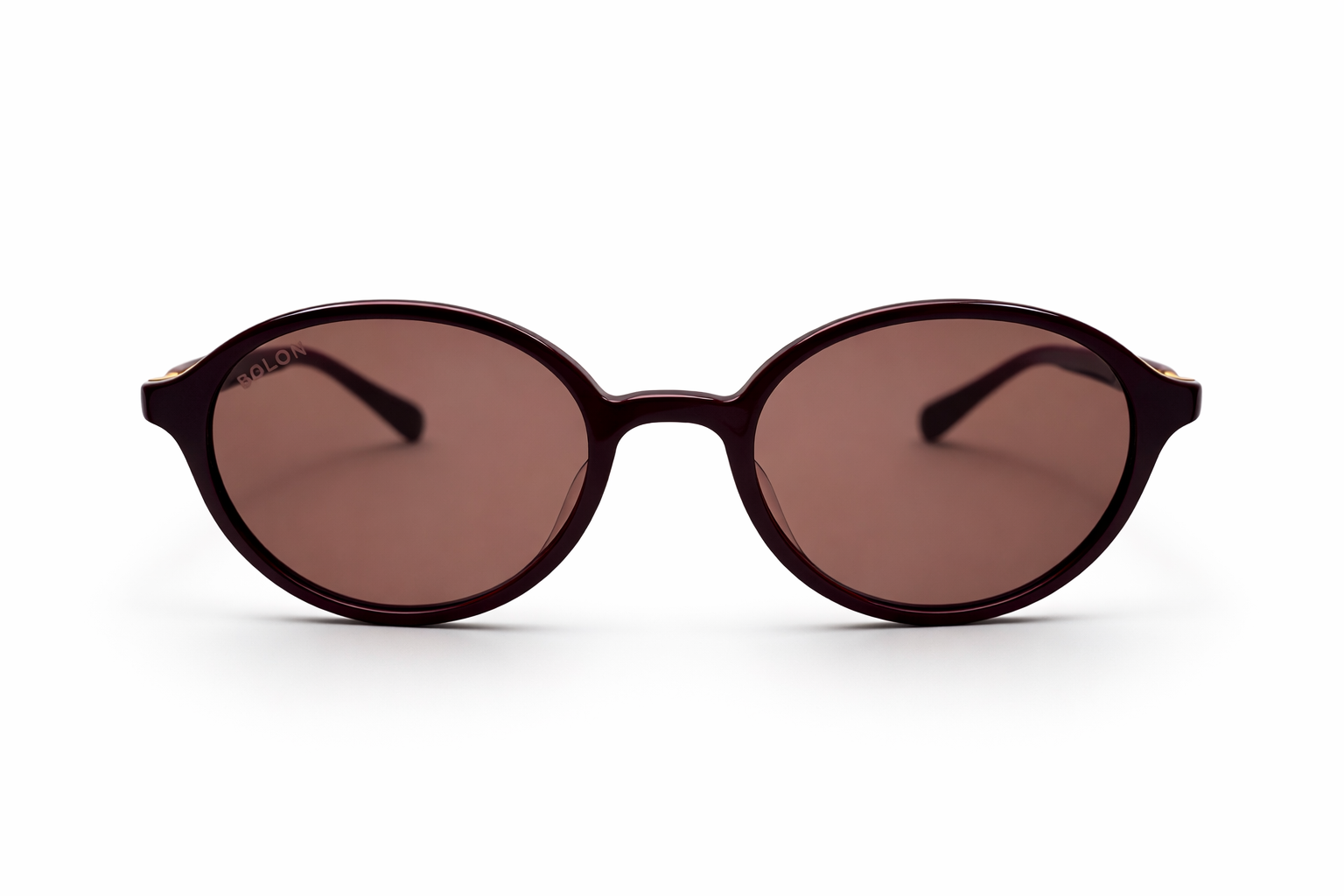Глянцева оправа у глибокому бордовому кольорі підкреслює преміальність моделі, а золотий логотип BOLON на заушнику додає впізнаваний стильний акцент.